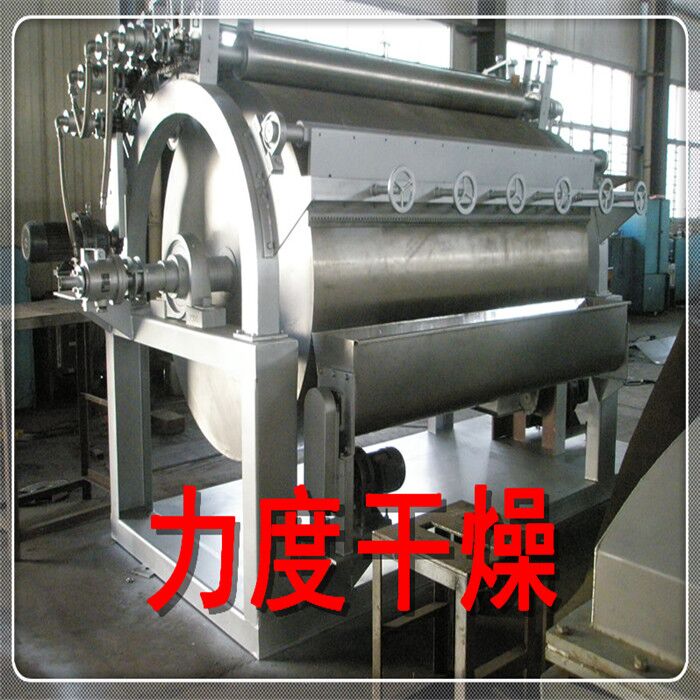 該設(shè)備是間接加熱,其傳熱方式是熱傳導(dǎo)。滾筒烘干設(shè)備工作原理簡單來說就是:濕物料從頂部的進(jìn)料口進(jìn)入,轉(zhuǎn)筒表面相接觸。由于轉(zhuǎn)筒內(nèi)部有蒸汽通過,濕料會(huì)粘附在轉(zhuǎn)筒外壁,形成一層較薄的料層。傳動(dòng)裝置將轉(zhuǎn)筒勻速轉(zhuǎn)動(dòng),料層中的水分會(huì)被逐漸蒸發(fā)。在壓輥的作用,轉(zhuǎn)筒外壁又粘附一層濕物料層。滾筒繼續(xù)轉(zhuǎn)動(dòng),在經(jīng)過第三和第四加料處后分別又增加了1層濕料層。^后當(dāng)料層厚度達(dá)到了工藝要求時(shí)(一般為0.3mm-2mm),不再加料,開始完全加熱干燥的過程。當(dāng)轉(zhuǎn)筒旋轉(zhuǎn)至刮刀處,料層的溫度與轉(zhuǎn)筒的溫度相差無幾。刮刀將料層刮下,由收料桶收集,完成整個(gè)干燥過程。