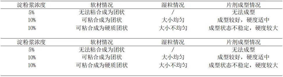 使用100℃的純化水中,按照5%、10%以及15%的濃度要求摻入淀粉,配制成為濃度不同的粘合劑,并分別取相同劑量進行軟材制作,對比其在軟材制粒效果及壓片成型性能方面的表現(xiàn)。