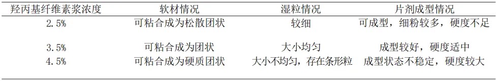 根據(jù)對比效果,使用3.5%羥丙基纖維素,所獲得的軟材粘合度更好,并且片劑成型之后的硬度適中,具體見表2。