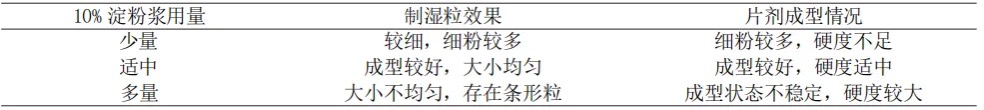 根據(jù)對比效果,使用10%粘合劑淀粉,所獲得的軟材粘合度更好,并且片劑成型之后的硬度適中,具體見表1。