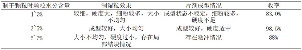 在實驗過程中,選用10%濃度的淀粉漿作為試驗粘合劑材料,分別制備含水量為1~3%、3~5%、5~7%共三種類型的干顆粒,通過對比不同含水量顆粒的制粒效果及其壓片后的成品收率,評估各條件對制粒及成型性能的影響。