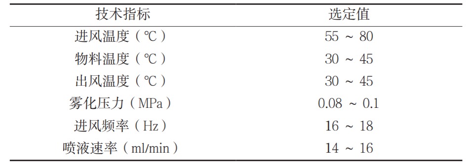 分別以糊精、甘露醇、微晶纖維素、乳糖和可溶性淀粉為單一制粒輔料,稱取重量均為 800 g,分別以純化水、5 % PVP-K30、5 %HPMC 作為粘合劑進行流化床制粒,粘合劑用量均為700 ml,流化床操作技術(shù)參數(shù)見表1。成粒后繼續(xù)干燥,水分控制在 3 % 以下,過 20 目篩網(wǎng)整粒,取出備用。