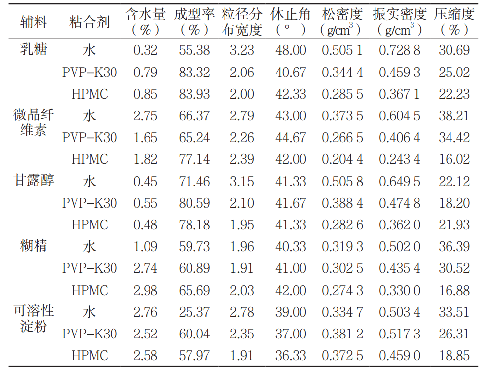 選用含水量、成型率、粒徑分布寬度、休止角、松密度、振實密度和壓縮度等 7 項指標作為顆粒質(zhì)量的評價指標,能夠反映顆粒的流動性與可壓性等物性質(zhì)量狀況。不同藥用輔料制備的顆粒物性質(zhì)量存在差異,乳糖和甘露醇以水為粘合劑制成的顆粒物性質(zhì)量較好,可溶性淀粉以 HPMC 為粘合劑制成的顆粒物性質(zhì)量較差。從制藥工藝角度考慮,由于顆粒質(zhì)量最終是體現(xiàn)在壓片質(zhì)量上,單一從顆粒指標評價顆粒物性質(zhì)量難免存在局限性,后續(xù)研究應(yīng)結(jié)合壓片質(zhì)量指標進行綜合評價分析。