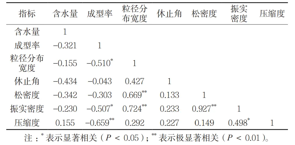 藥用輔料流化床制備的顆粒質(zhì)量涉及因素較為復(fù)雜,不但與輔料自身性質(zhì)有關(guān),而且還與流化床制粒工藝參數(shù)有關(guān),同時還與粘合劑的種類和用量等因素有關(guān)。根據(jù)顆粒粉體的物理特性,將顆粒粉體學(xué)性質(zhì)歸納為均一性、堆積性、流動性、可壓性和穩(wěn)定性5 個方面[13]。松密度和振實密度用于顆粒粉體堆積性的表征,粒徑分布寬度用于顆粒粉體均一性的表征,休止角和壓縮度用于顆粒粉體流動性的表征。通過相關(guān)性分析結(jié)果可知,松密度、振實密度、粒徑分布寬度、壓縮度有顯著相關(guān)性或極顯著相關(guān)性,表明顆粒粉體堆積性、均一性和流動性存在一定相互關(guān)系。