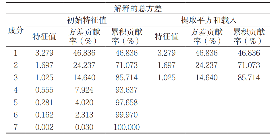 對不同輔料制成的 15 種顆粒 7 項物性指標原始數(shù)值經(jīng)標準化處理后進行主成分分析。由表4 可知,初始特征值大于 1 的主成分有三個,且這三個主成分的方差貢獻率之和在 85 % 以上,即代表性較大,其余成分的初始特征值均趨于平坦且數(shù)值小于 1,即代表性較小。顆粒物性指標前三個主成分的方差貢獻率分別為 46.645 %、24.237 %、14.640 %,累積方差貢獻率為 85.714%,也可看出三個主成分具有顯著代表性。