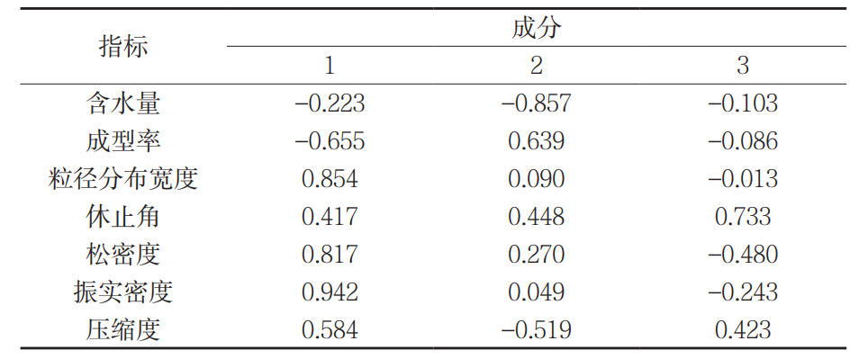 顆粒物性指標的主成分載荷矩陣結(jié)果見表5,可反映各主成分對顆粒物性指標的影響程度。由表5 可知,對di一主成分產(chǎn)生正向影響的物性指標有粒徑分布寬度、振實密度、松密度和壓縮度。其中,振實密度的載荷數(shù)zui大,數(shù)值為 0.942,其次為粒徑分布寬度,數(shù)值為 0.854。成型率的載荷數(shù)較高,但對di一主成分產(chǎn)生負向影響。由表 3 可知,粒徑分布寬度與松密度和振實密度呈極顯著正相關(guān),與成型率呈顯著負相關(guān),松密度與振實度呈極顯著正相關(guān),振實密度與壓縮度呈顯著正相關(guān),即粒徑分布寬度的變化,均可直接或間接影響成型率、松密度、振實密度和壓縮度,因此將粒徑分布寬度作為di一主成分的代表指標。對第二主成分產(chǎn)生負向影響的物性指標有含水量和壓縮度,對第二主成分負向影響zui大的是含水量,載荷數(shù)為 -0.857。第二主成分正向影響中,以成型率的載荷數(shù)zui大,載荷數(shù)為 0.639,其次是休止角。第二主成分大時,成型率和休止角會相應(yīng)增大,而含水量和壓縮度這兩個指標值會減小。第三主成分正向影響的指標有休止角和壓縮度,以休止角的載荷數(shù)zui大,載荷數(shù)為 0.733。對第三主成分產(chǎn)生負向影響的物性指標中,負向影響zui大的是松密度和振實密度,以松密度的載荷數(shù)zui大,載荷數(shù)為 -0.480。第三主成分大時,休止角和壓縮度會相應(yīng)增大,而松密度和振實密度這兩個指標值會減小。