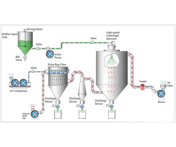 空氣經(jīng)過濾和加熱,進(jìn)入干燥器頂部空氣分配器,熱空氣呈螺旋狀均勻地進(jìn)入干燥室。料液經(jīng)塔體頂部的高速離心霧化器,(旋轉(zhuǎn))噴霧成極細(xì)微的霧狀液珠,與熱空氣并流接觸在極短的時(shí)間內(nèi)可干燥為成品。成品連續(xù)地由干燥塔底部和旋風(fēng)分離器中輸出,廢氣由風(fēng)機(jī)排空。