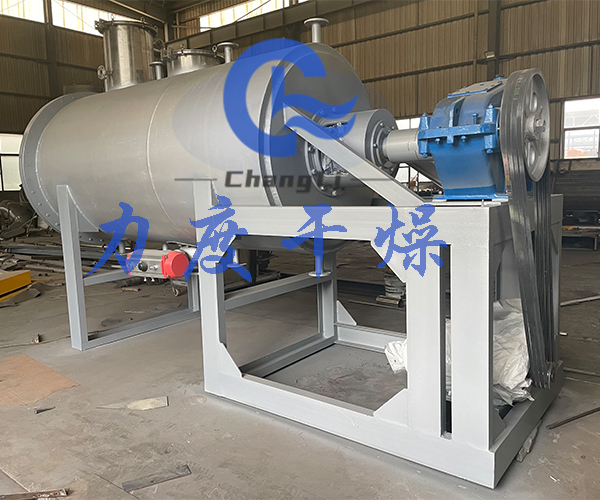 物料通過進(jìn)料口進(jìn)入干燥室,經(jīng)過加熱器加熱使其蒸發(fā)出水分,水分被真空系統(tǒng)抽出,然后由耙式攪拌器進(jìn)行攪拌,使物料表面均勻干燥,達(dá)到干燥的效果。