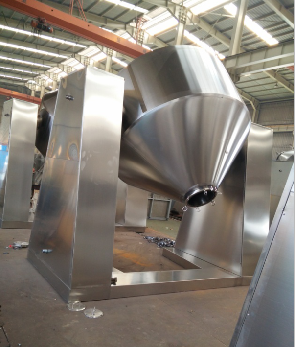 雙錐干燥機(jī)由帶夾套的雙層容器(本體)、驅(qū)動系統(tǒng)、加熱裝置、真空吸引裝置和機(jī)架等部分構(gòu)成。本體結(jié)構(gòu)設(shè)計(jì)采用了雙圓錐定軸回轉(zhuǎn)式無機(jī)械攪拌的重力混合容器結(jié)構(gòu),利用物料流動所產(chǎn)生的重力形成物料間自然摩擦層流的混合方式,同時結(jié)合密閉容器進(jìn)行真空操作的特點(diǎn)。