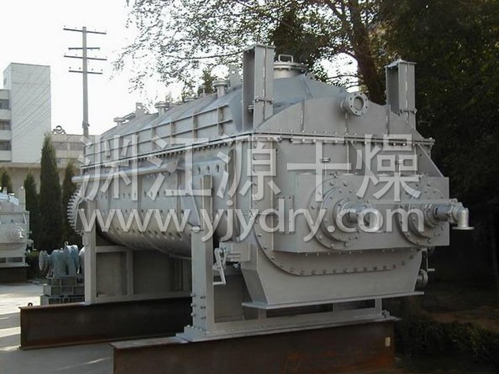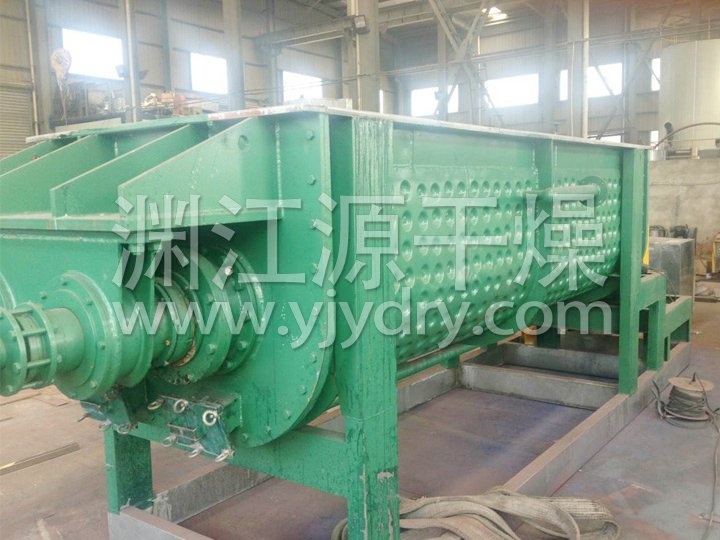 空心軸上密集排列著楔型中空漿葉,熱介質(zhì)經(jīng)空心軸流經(jīng)漿葉。單位有效容積內(nèi)傳熱面積很大,熱介質(zhì)溫度從-40℃到320℃,可以是水蒸汽,也可以是液體型:如熱水、導(dǎo)熱油等。間接傳導(dǎo)加熱,沒(méi)有攜帶空氣帶走熱量,熱量均用來(lái)加熱物料。熱量損失僅為通過(guò)器體保溫層向環(huán)境的散熱。楔型漿葉傳熱面具有自清潔功能。物料顆粒與楔型面的相對(duì)運(yùn)動(dòng)產(chǎn)生洗刷作用,能夠洗刷掉楔型面上附著物料,使運(yùn)轉(zhuǎn)中一直保持著清潔的傳熱面。漿葉干燥機(jī)的殼體為Ω型,殼體內(nèi)一般安排二到四根空心攪拌軸。殼體有密封端蓋與上蓋,防止物料粉塵外泄而充分發(fā)揮作用。